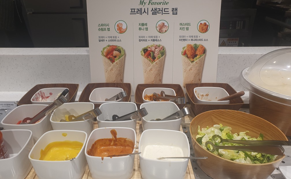 튜나, 쉬림프, 치킨텐더 중에서 골라서 직접 만들어 먹을 수 있는데, 소스와 채소까지 골고루 많아서 맥도날드보다 더 맛있게 먹을 수 있어요.