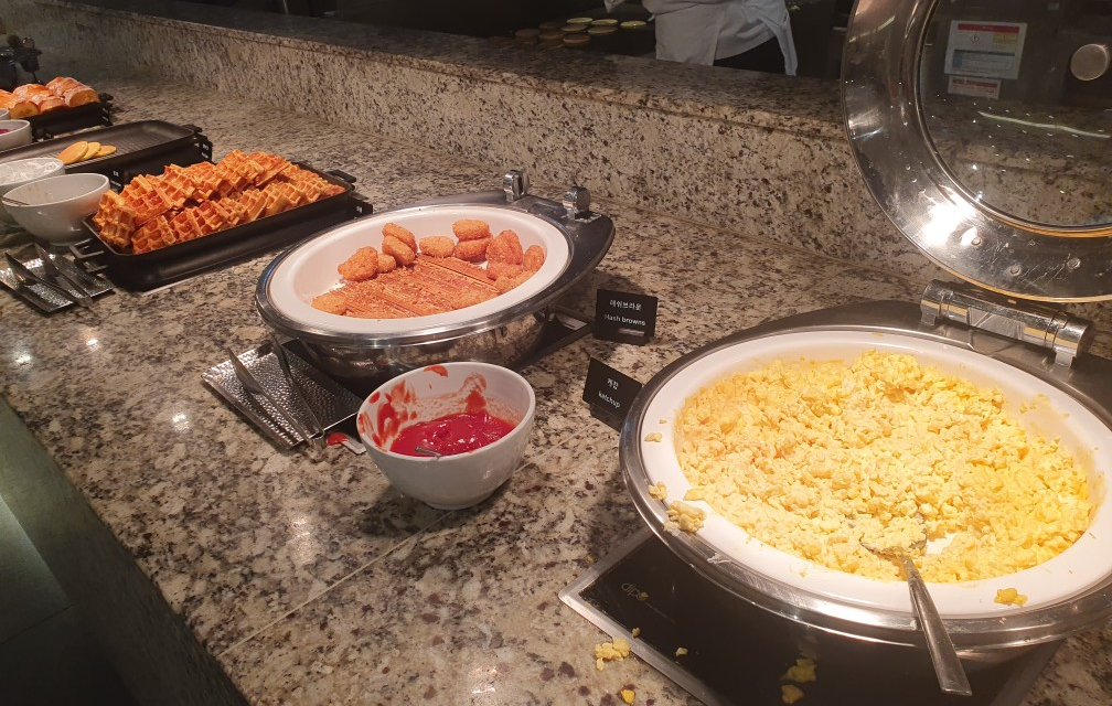 에그스크렘블, 소시지, 해쉬브라운, 와플 등 일반적인 조식뷔페의 메뉴들.